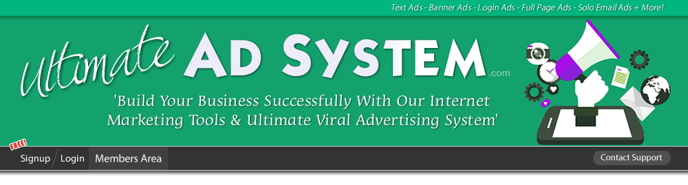 UltimateAdSystem.com is not a multi-level marketing scheme or a get-rich-quick program, we are purely an advertising platform. We don't require you to have a website or sell any product to use our service. We do not require you to refer anyone to our site to use our service. You won't get rich by using our internet advertising program. This website uses cookies. Being a member and/or continued use of this website indicates that you accept our cookies policy. Thank you, we very much appreciate your support and being a member on our site! Privacy Center | Terms and Conditions | Earnings Disclaimer | Spam Policy | Privacy Policy © Copyright - UltimateAdSystem.com ![]() | ||||||||||||||||||||||||||||||||||||||||||||||||||||||||||||||||||||||